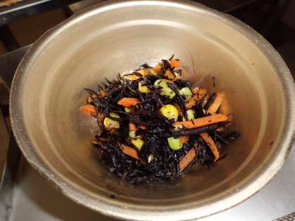 また,ひじきのソテーの中の枝豆のきみどり色・人参のオレンジ色が色鮮やかに仕上がりました。