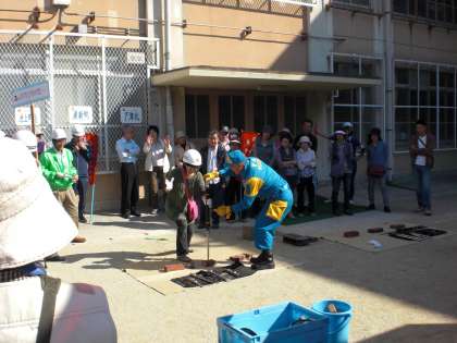 「初期消火訓練」「煙中体験訓練」「起震車体験訓練」「レスキュー車展示訓練」「放水訓練」などを3グループに分かれて体験しました。