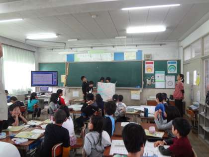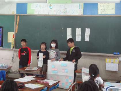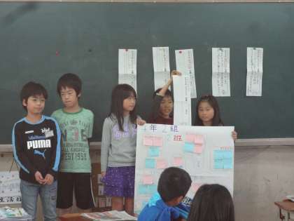 グループでまとめた内容を発表しています。 今後のエコライフの目標も発表しています。