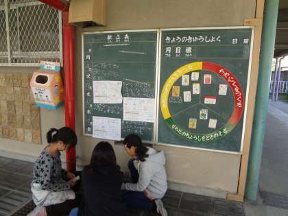 給食後の様子です。 給食委員会の子どもたちが栄養黒板の作成をしていました。