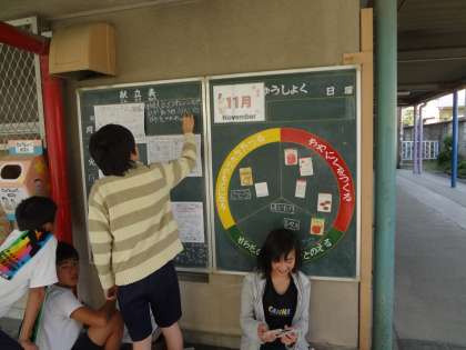 給食後の様子です。 給食委員会の子どもたちが献立黒板の作成をしていました。