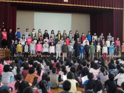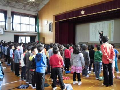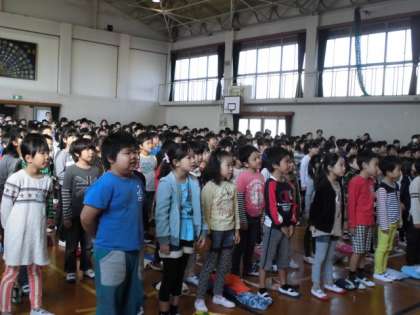 学習発表会が近づいています。はじめに,6年生のお手本を聴き,全校練習をしました。