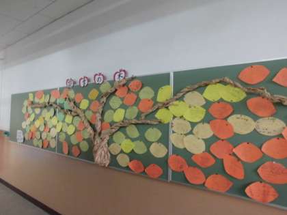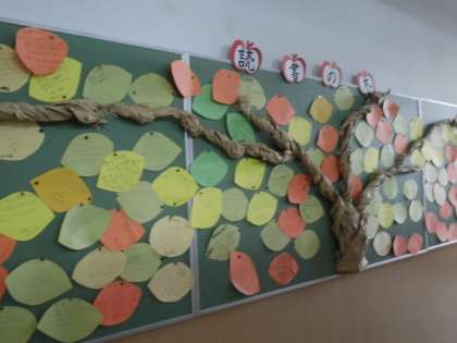 読書週間の取組のひとつとして,図書室前に『読書の木』をつくりました。これは,たくさんの学年の人たちのおすすめの本を紹介して掲示しています。友達の感想や紹介文を読んで,自分からは,手に取らないジャンルの本にも,興味をもってほしいと思います。いろんな本の紹介がされていて,『読書の木』を読むのが毎日楽しいです!