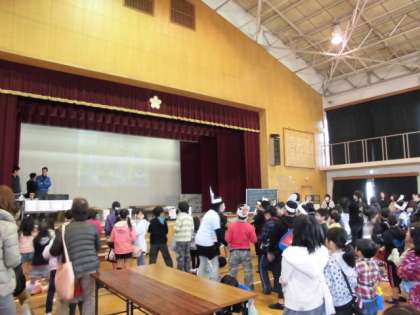 1122親子のつどいその3 公開日 2014/11/22 更新日 2014/11/22 学校の様子 9時過ぎから,コーラス部による「妖怪たいそう」が始まりました。 アナウンスや映像もあって,たくさんの人たちがたのしく歌いながら踊ることができました。