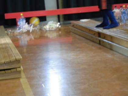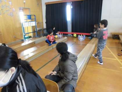 1122親子のつどいその4 公開日 2014/11/22 更新日 2014/11/22 学校の様子 『ペットボトルボーリング』 何本倒れるかを競い,上位者は黒板に名前が書かれていました。たくさんペットボトルを倒そうとがんばっていました。