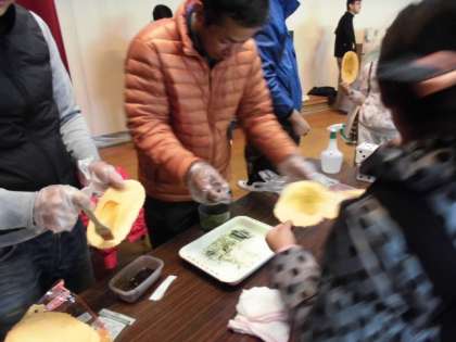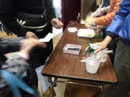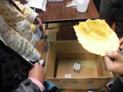 1122親子のつどいその7 公開日 2014/11/22 更新日 2014/11/22 学校の様子 『たこせん』 サイコロの出た目が同じなら,たこせんを2枚GET! きちんとアルコール消毒をしてから,いただきます。