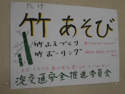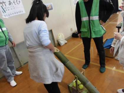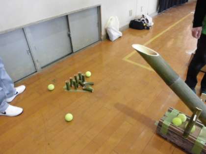 1122親子のつどいその13 公開日 2014/11/22 更新日 2014/11/22 学校の様子 『竹あそび』 交通安全推進委員会のコーナーでは,獅子おどしの水の代わりに,テニスボールを入れて,置かれた竹をたおしていきます。