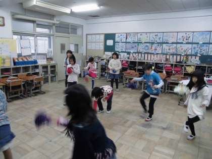 韓国の遊びチェギチャギに挑戦! 公開日 2014/11/26 更新日 2014/11/26 学校の様子 総合の学習で,韓国の伝統的な遊びであるチェギチャギで遊びました。日本の蹴鞠に似た遊びで,ひらひらとしたきれいな羽がついた「チェギ」を蹴りあげ,落とさないように蹴り続けます。なかなか連続で蹴り続けることができず,苦戦していた子どもたちでした。誰が一番続けられるか競争もしながら楽しみました。