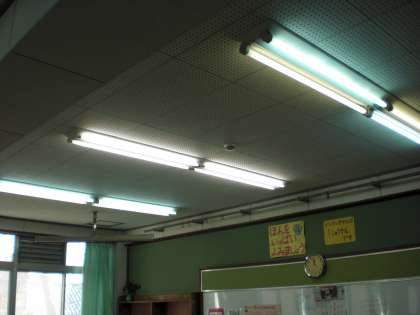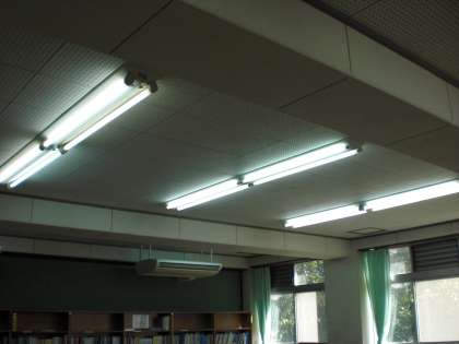 先日,学校薬剤師の先生に照度検査をしていただいたところ,図書室が少し暗いという検査結果が出ました。そこで,業者に工事を依頼して,図書室の天井の蛍光灯を黒板側と真ん中に2台ずつ,計4台蛍光灯の数でいうと8本増やしました。おかげで見違えるほど明るくなりました。これで図書室での読書が今まで以上にしやすくなったと思います。読書量も増えるでしょう。