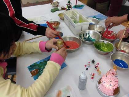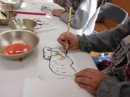 1213土曜学習その2 公開日 2014/12/13 更新日 2014/12/13 学校の様子 実際に自分たちでも,見本に習って,和紙に描いていきました。水の量を上手に調節しながら,色を重ねていきます。