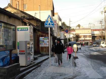 朝,雪の中,みんな元気よく集団登校をしています。