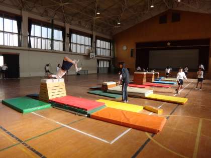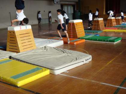 どんどん練習して自分のできる技を磨いていく。技がきれいに決まると思わず拍手が起こっていました。励まし合いながら,ルールを守って安全に気を配りながらも,のびのびと自分の技を磨いている6年生。たくましく成長しています。