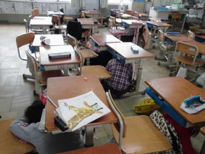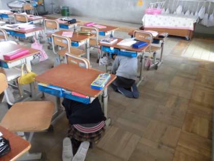 教室では机の下に身をいれ,運動場でも,さっと真ん中にみんなが集まっていました。