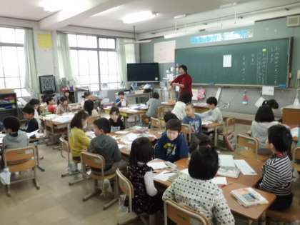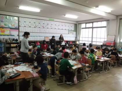 1年生の様子です。生活科「おみせやさんごっこをしよう」の学習で,カードに商品をかいていました。