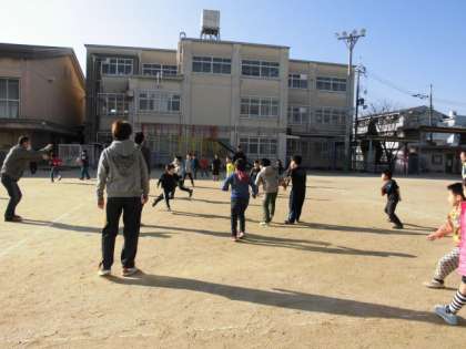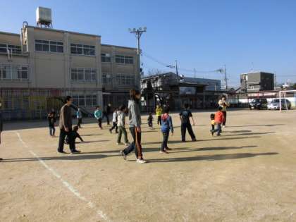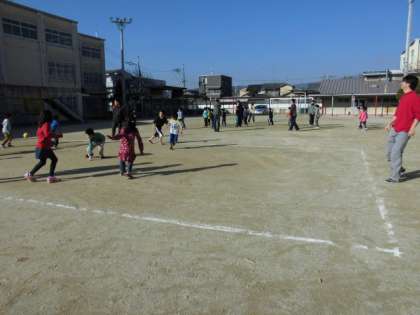エキシビションゲームで,おやじの会の方や保護者の方にも入ってもらい,みんなでドッジボールを楽しみました。