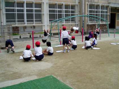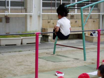 3年生は,体育で鉄棒の学習をしています。明親小学校の運動場は狭いので,固定式の鉄棒は少なく,移動式鉄棒を利用しています。鉄棒が動かないように,順番を待つ子どもは,鉄棒を押さえて声援を送ったり,優しくアドバイスをしたりしています。