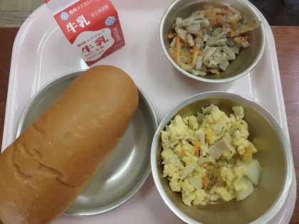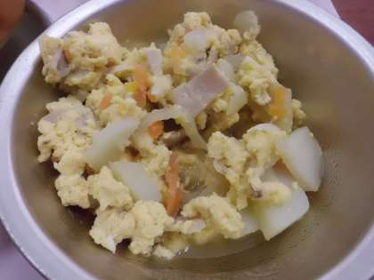 ハム・じゃがいも・たまねぎ・にんじんが入った具沢山のいり卵です。