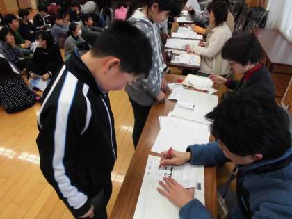 全校児童が算数ノート検定を受けました。ノート検定は,算数の授業で問題を解くために,まず,自分でしっかり考えたことを記録し,友達の考えや教師の話を聞く中で考えの足あとを残すノートづくりをして,算数の力を高めることを目的としています。