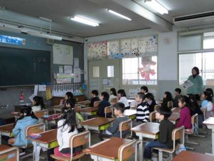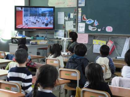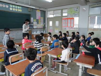 子どもたちは,1年生の教室で写真を見せてもらいながら,学校行事について話を聞きました。