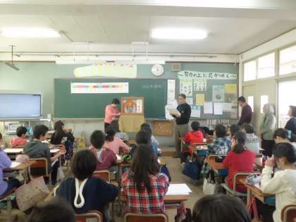 淀みず車の会の方々に来ていただき,淀の歴史を紙芝居で見せていただきました。6年生は歴史の学習をしているので,興味深そうでした。