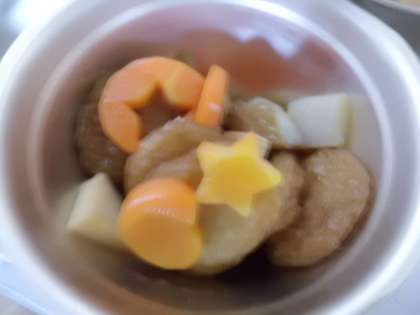 たから,お楽しみの幸せにんじんを平天とこんにゃくの煮つけの中に入れました。