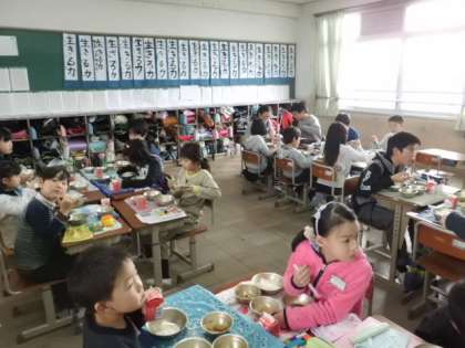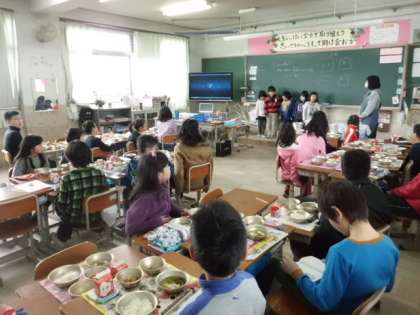 給食の準備も今日は,4・5年生が担当します。3年生は配膳等の準備・後片付け,1年生は「いただきます」2年生は「ごちそうさま」の挨拶を担当しました。