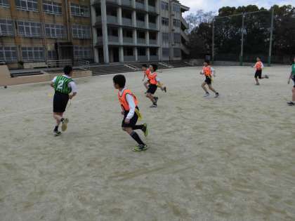 昨日の午前中は,明親小学校と美豆小学校のタグラグビー部の今年度最後の交流試合でした。明親からは,4年生チーム,5年生チーム,6年生チームの3チームが参加し,美豆小の子どもたちやおやじの会の皆さん,そして教員チームとの試合を楽しみました。