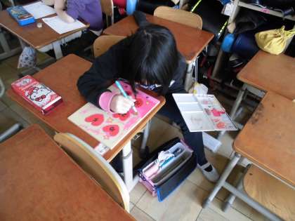 3年生は図工の最後の作品として,玉転がしゲームを作っています。今はまだ,板に絵を描いているところですが,これからかなづちで釘を打っていきます。写真は早く作品を仕上げたくて,休み時間にも自主的に取り組む子どもたちの様子です。得点の位置や点数を工夫し,楽しみながら描いています。