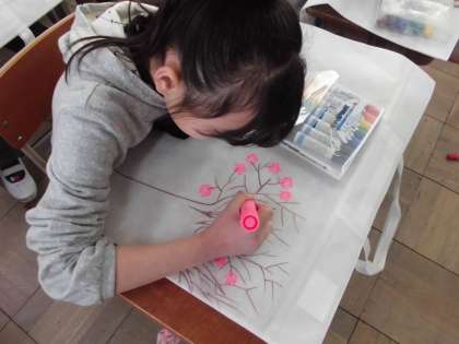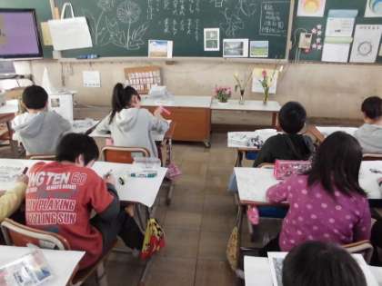 3時間目の図工の学習で,作品袋に「春」をテーマにした絵を描きました。タンポポや桜,小鳥,ちょうちょなど,一人一人が思いを込めて描いていました。