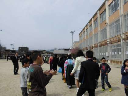 最後の話を聞いた後,在校生みんなが作った『卒業を祝う掲示板』をいろいろ見ながら,運動場に出てきました。在校生・教職員・保護者の方々で,花道をつくりました。