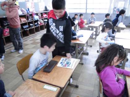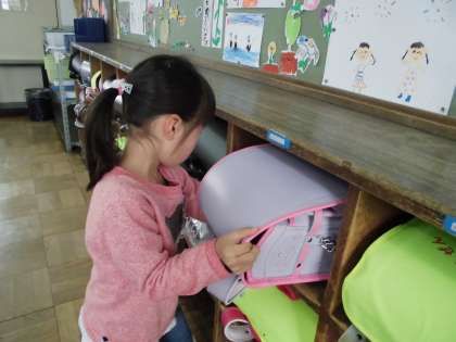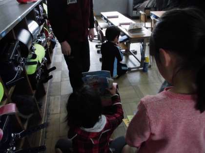 0409授業前の様子その1 公開日 2015/04/09 更新日 2015/04/09 学校の様子 1年生が教室で困らないように,6年生がかばんの片付け方・提出物の出し方・お道具箱の入れ方を教えてくれました。頼りになる6年生です。