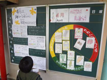 給食後の様子です。 昨年度の給食委員会の子どもが,栄養黒板の作成をしていました。
