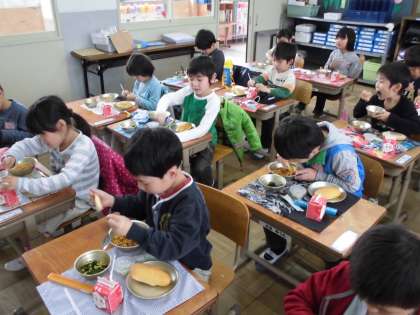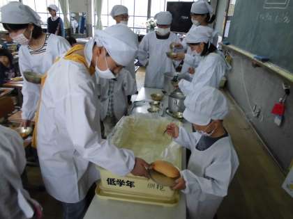 今日が,初めての給食の日!3時間目くらいから,「まだ?」と何度も確認の声が・・・。エプロン,帽子,マスクをつけて,当番はじまり。ちょっと心配しましたが,大丈夫,今日も6年生が,見守ってくれました。配りも,後片付けも,ばっちり出来ました。