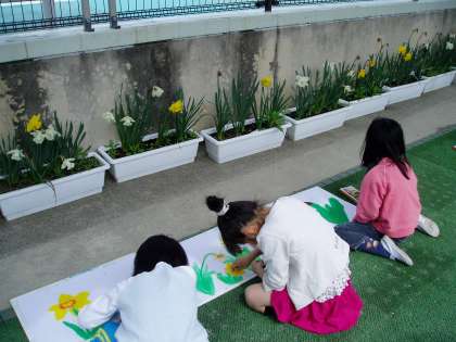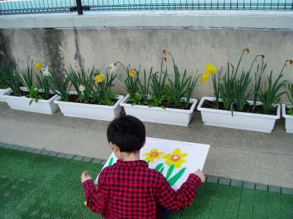 昨年度に自分たちで植えた水仙の花を描いています。1年生の入学式の日にも,この水仙は美しく咲いていました。
