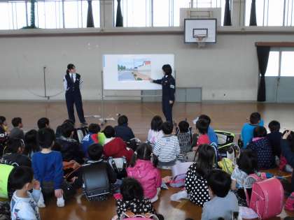 給食終了後,体育館に1年生が全員が集合しました。交通巡視員さんが来校くださり,安全指導をしていただきました。正しい道路の渡り方や安全な下校の仕方などくわしく教えていただきました。ありがとうございました。