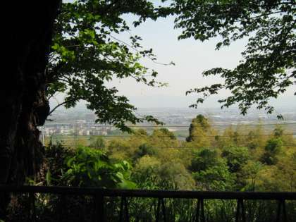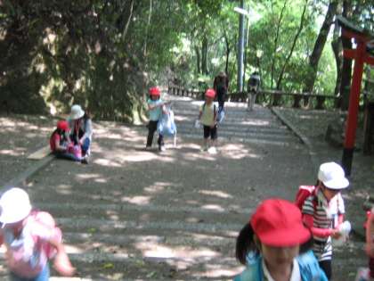 八幡駅から,徒歩で山頂へ向かいます。小さい体を,元気いっぱいにゆらしながら登っていきます。石段がずっと上まで続いていました。歩みを進めていくと,山頂です。さっそく,展望台へ行き,淀の町を眺めました。明親小学校や自分のお家は,見えたでしょうか。