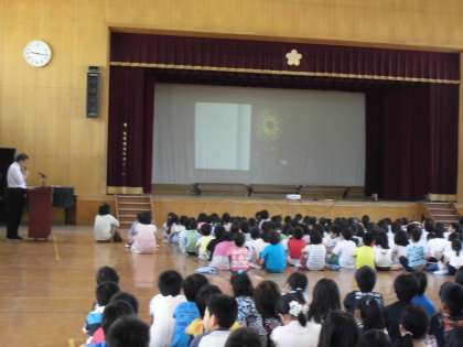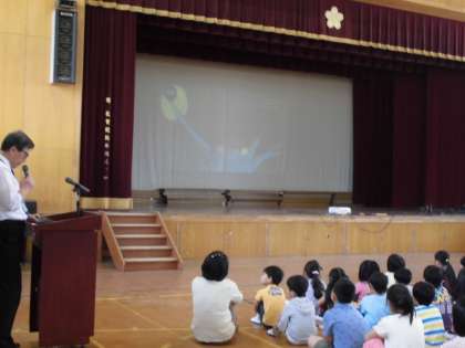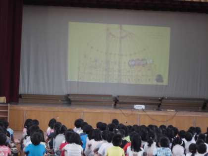 人権という観点から,今朝は,朝会で『まっくろネリノ』の本の読み聞かせをしてくださいました。体育館のスクリーンに挿絵を映しながらの読み聞かせです。みんな真剣に聞いていました。
