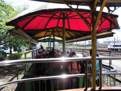 最後にはみんなが楽しみにしていた、動くSL機関車「スチーム号」に乗車!!初めて聞く大きな汽笛の音に耳を押さえてびっくり!!大笑いしながら梅小路公園の景色を楽しみました。