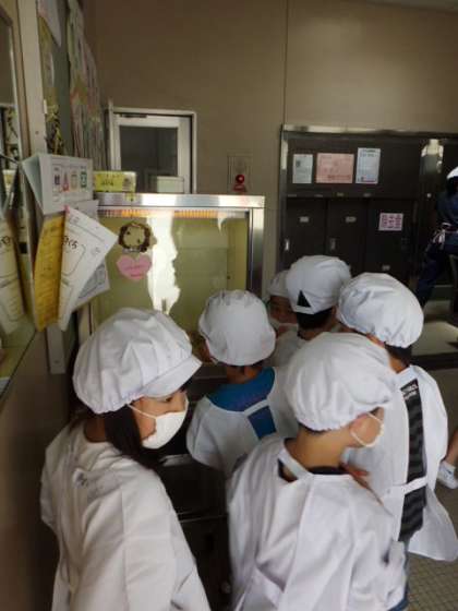 給食時間,給食室に「いただきます!」元気な挨拶をする1年生です。