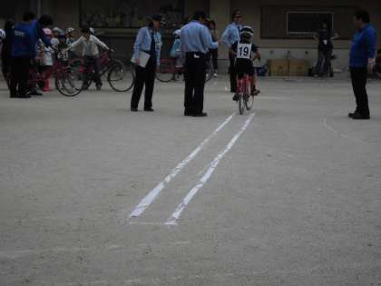 自転車の乗り方のテストの中には,ポールを置いてそこを足をつかずにジグザクに運転をするものや細い白線の中をはみ出さずに速く運転できるかというものもありました。この2つの実技テストは,とても楽しかった様子です。