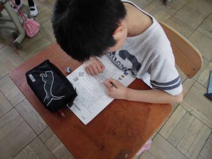 今日の自転車教室に備え,事前に勉強もしました。そして,筆記試験も受けました。いい結果だといいなと言いながら,しっかりと考えて○×を書きました。