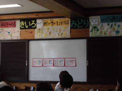 内輪栄養教諭による和食についての話のあと,子どもたちの食生活についての交流をしました。
