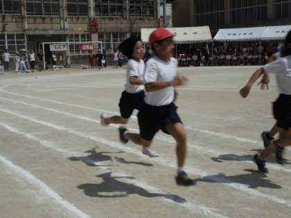 5年生の100メートル走です。カーブをうまく切り抜け,直線で勝負します。