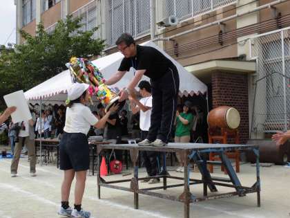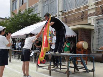 優勝の白組へ優勝旗・賞状・トロフィの授与がありました。2位だった赤組もよくがんばりましたね。