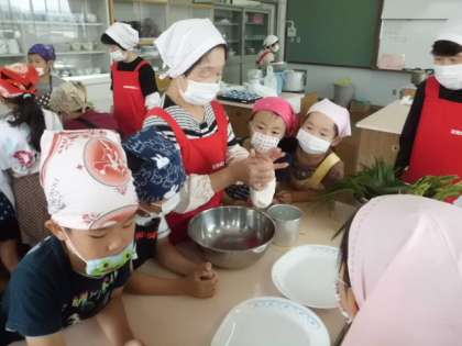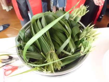 朝早くから女性会の方々が準備に来てくださいました。毎年3年生がお世話になっているちまきづくりです。昨日,葦の葉を取りに行ってくださいました。近頃は葉が少なくなり大変だったようです。