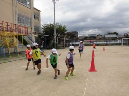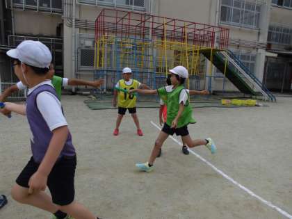 先週からリレーの学習に取り組んできました。初めはバトンゾーンも有効に使えず立ち止ったままバトンを受け取る様子が見られていましたが,この2週間でバトンの渡し方に工夫を加えたり,リードした状態でバトンを受け取ったりすることもずいぶんできるようになりました。今日は白熱の最後のリレー学習となりました。
