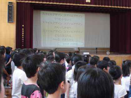 5・6年生の計画委員の人達の司会・進行のもと,全校合唱をしました。曲名は『スマイル・アゲイン』です。