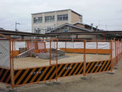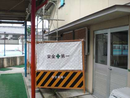 7月5日の日曜自由参観には,多数の保護者の皆様や地域の方々にご来校いただきありがとうございました。さて,夏休み期間中に給食室の耐震工事が行われます。工事に先駆けて資材置き場と足場が設置されました。工事期間中,何かとご不便をおかけすることと思いますが,ご理解の程よろしくお願い申し上げます。