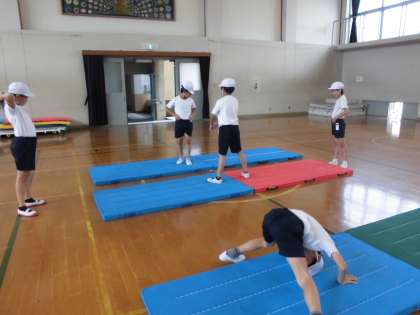 マット運動の学習も佳境に入ってきました。木曜日には組み合わせ技をテストします。どの技とどの技を組み合わせるか考え,ねらい1,ねらい2の流れに沿って学習を進めました。写真の1枚目は,ねらい1で班ごとに分かれ,自分のできる技を確実にするための練習を行っています。2,3枚目はねらい2の学習で,それぞれのめあてに合った学習の場を選択し,レベルアップを目指している様子です。