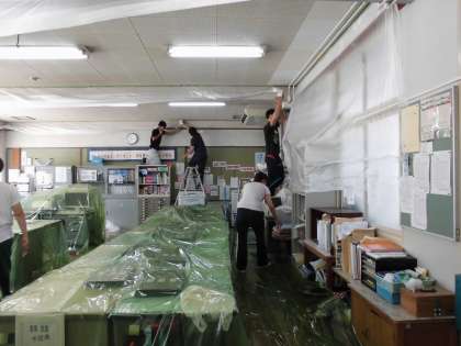 職員室の天井が白くなれば,もっと光が反映して明るくなるかな〜ということで,まずは,養生テープで職員室中を張り巡らせていきました。
